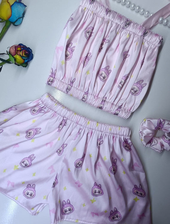 ست سه تیکه ساتن ال ایکس طرح لبوبو بنفش مناسب سایز 36 تا 42